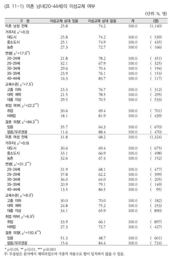 결혼 뿐 아니라 연애시장도 분위기가 심상치 않다. 요새 20대들이 연애시장에 참여하지 않는다고 한다. 2018년 전국 출산력 및 가족보건 복지 실태 조사에 따르면, 20대 남성의 약 70%, 20대 여성의 약 65%가 이성교제를 하지 않는다고 답변하였다. 4년 전 데이터긴 하지만 지금은 이 수치가 더 악화되었으면 악화되었지 드라마틱하게 개선되었으리라고는 생각되지 않는다.
