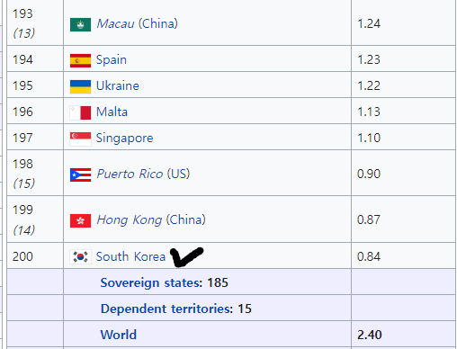 위키피디아에서 세계 출산율을 검색해보니, 2020년 세계은행에서 조사한 세계 출산율 통계에서 우리나라는 200위 중 200위. 전 세계 꼴찌를 당당히 마크했다. 이 당시는 0.84였는데 가장 최근 통계를 찾아보니 0.75로, 안 그래도 떨어지기 힘든 출산율이 더 떨어지고 있는 최악의 상황이다.